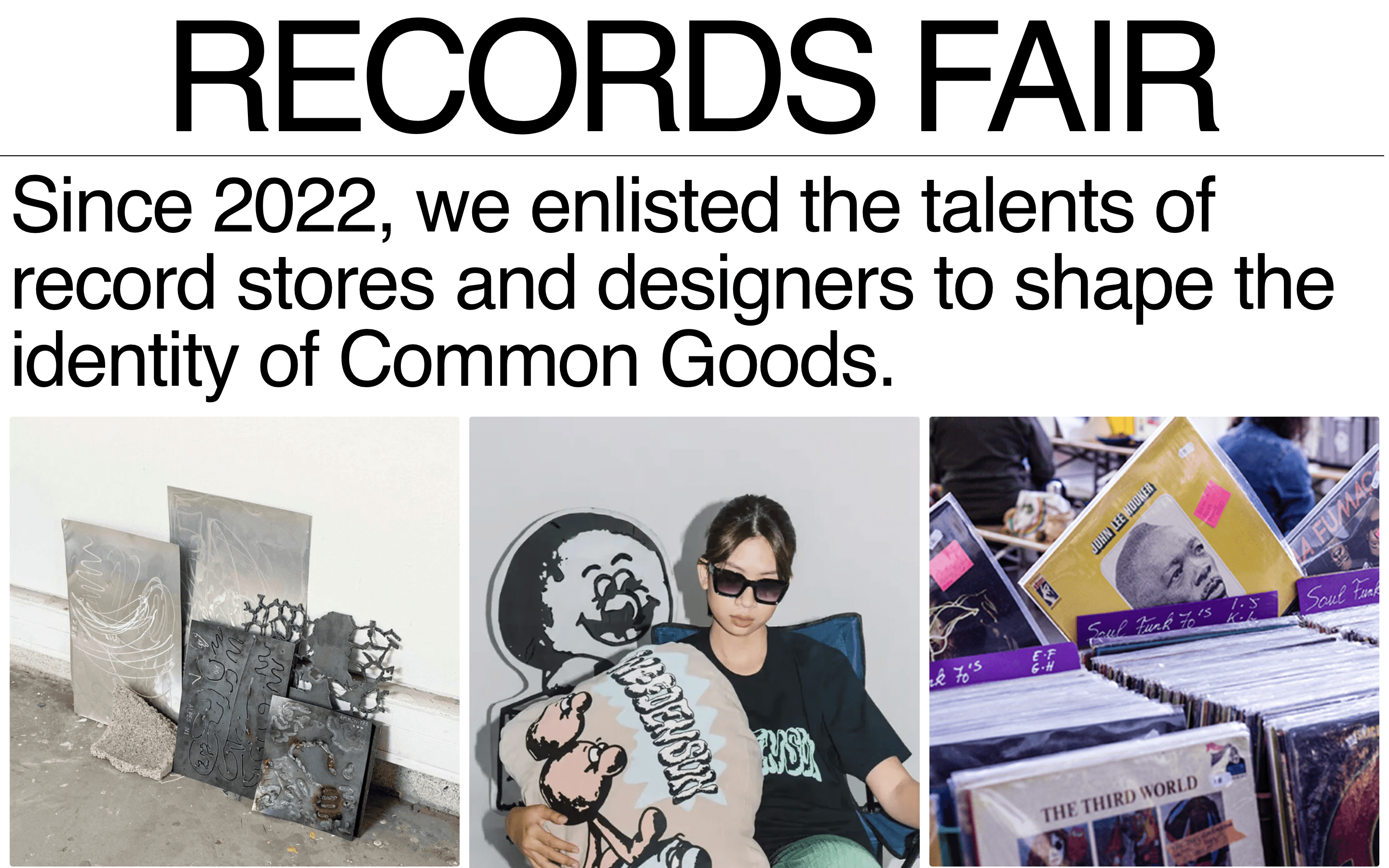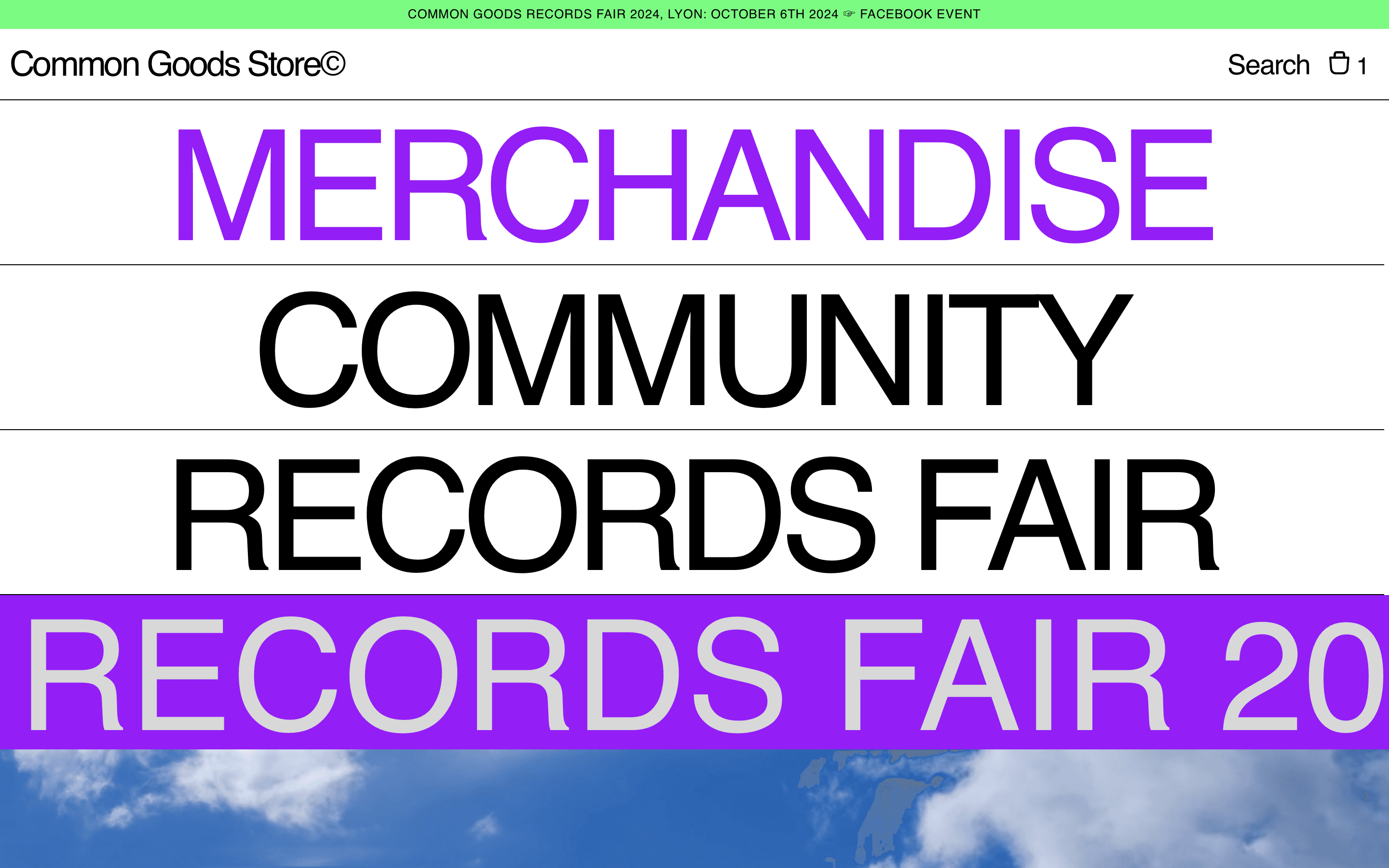 Since 2022, we've been calling on the talents of record shops and designers from our creative community to shape the identity of Common Goods, a record fair held at Heat, Lyon (FR). Each year, we're excited to produce unique merchandising, posters and ephemera to share with the public. We’ve decided to build an Eshop dedicated to these goodies, for online sales and live demos.